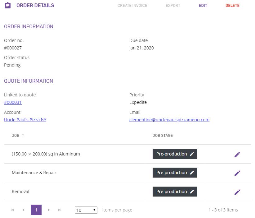 - Order status – when created, an order receives by default the “Pending” status. Once one of its jobs moves from Pre-production to other stage, the order’s status will change to “In progress”. When the last job moves to Completed stage (or is Cancelled), the order’s status will automatically change to “Completed”.
